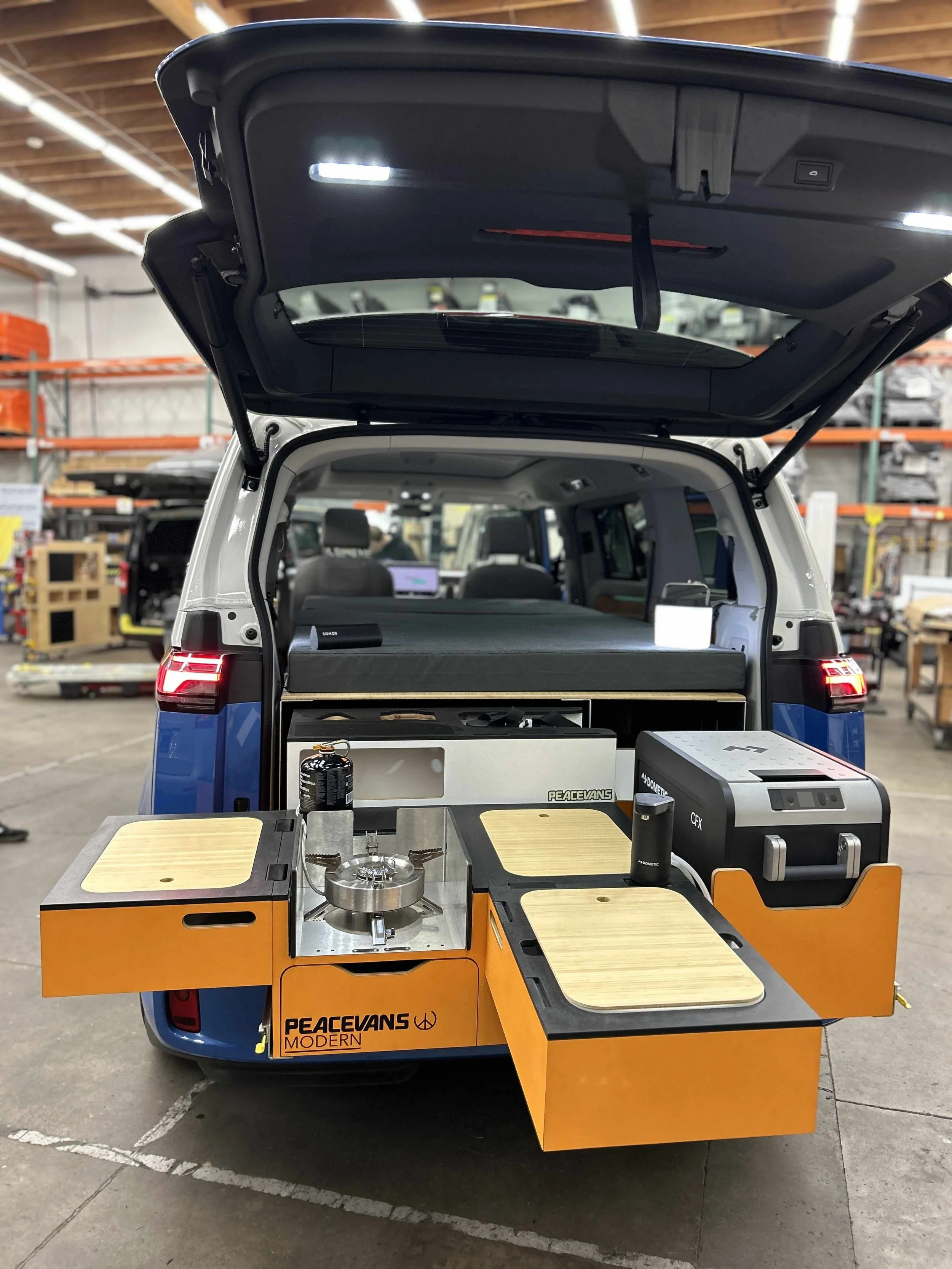 This modular unit attaches to the Peace Vans Rear Kitchen Box unit and turns the ID. Buzz into a comfortable little camper. An additional $350 profit margin for a dealer